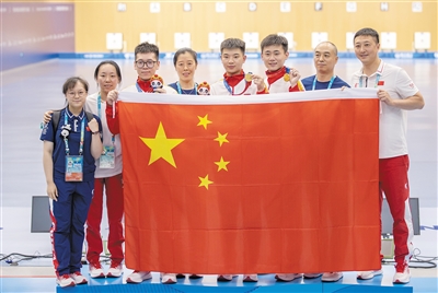 7月30日,中国队选手与教练团队在颁奖仪式后合影。当日,在成都举行的第31届世界大学生夏季运动会射击项目男子50米步枪三种姿势团体决赛中,中国队获得冠军。 新华社记者 黄伟摄