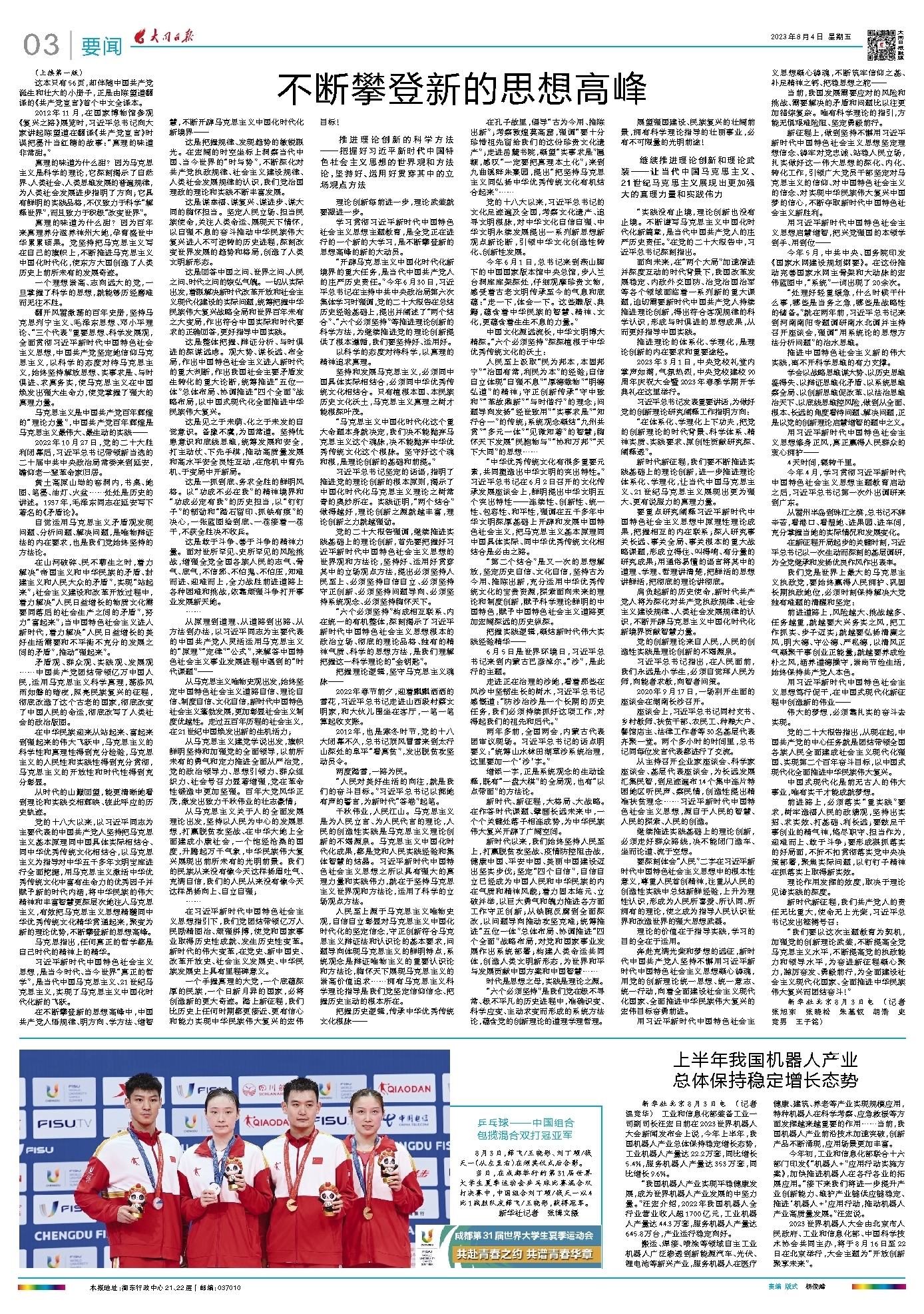 今年初,工业和信息化部联合十六部门印发《“机器人+”应用行动实施方案》,加快推进机器人在各行各业的拓展应用。“接下来我们将进一步提升产业创新能力、维护产业链供应链稳定、推进‘机器人+’应用行动,推动机器人产业高质量发展。”汪宏说。