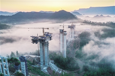 8月4日在湖南省湘西土家族苗族自治州龙山县拍摄的桑龙高速公路湾档河特大桥施工现场(无人机照片)。
