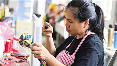 在靖西市旧州村,绣娘在填充缝合绣球(8月2日摄)。广西靖西市位于我国西南边陲,有制作绣球的悠久历史,被誉为“中国绣球之乡”。 新华社记者 张爱林摄