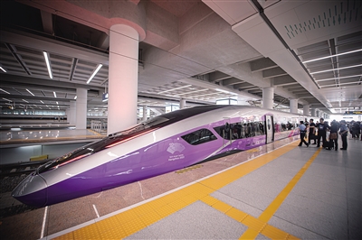 当日,由浙江交通集团购置、为杭州第19届亚运会量身定制的复兴号亚运智能动车组搭载近百名乘客从杭州西站出发,在合杭高铁湖杭段开启首次试乘活动。复兴号亚运智能动车组采用杭州亚运会主形象色“虹韵紫”涂装,针对浙江多丘陵山地的地形特点采用定制化的技术创新方案,提升了乘客的乘坐舒适度,将在杭州亚运会赛事期间承担重要的交通转运功能。 新华社记者 江汉摄
