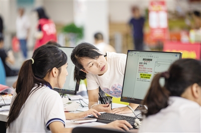 8月9日,在浙江省金华市婺城区零工服务中心大厅里,工作人员帮助求职者查找用工信息。今年2月初,婺城区零工服务中心作为金华市规模最大的零工市场正式投入运行。据统计,这个灵活就业服务平台至今已累计接待务工人员超过3.2万人次。 新华社发(胡肖飞摄)