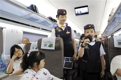 正值暑期,南京客运段联合南京东机辆段、南京动车段开展让职工子女体验父母乘务工作的萌娃夏令营,让孩子们在暑期里收获一段难忘的记忆。图为8月8日,小列车长在活动中体验向乘客介绍乘车规定。 新华社记者 柳文惠摄
