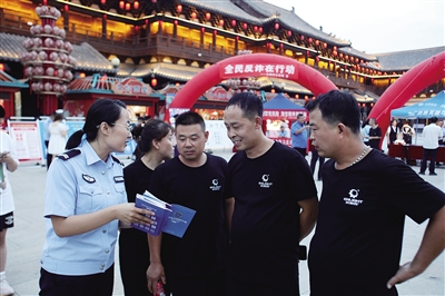 图为市公安局反诈中心民警向过往市民宣传反诈知识。 本报记者 韩堃摄