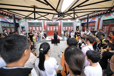 8月12日,在河北省沧州市吴桥杂技大世界景区江湖文化城,游客们观看杂技艺人表演传统杂技节目。