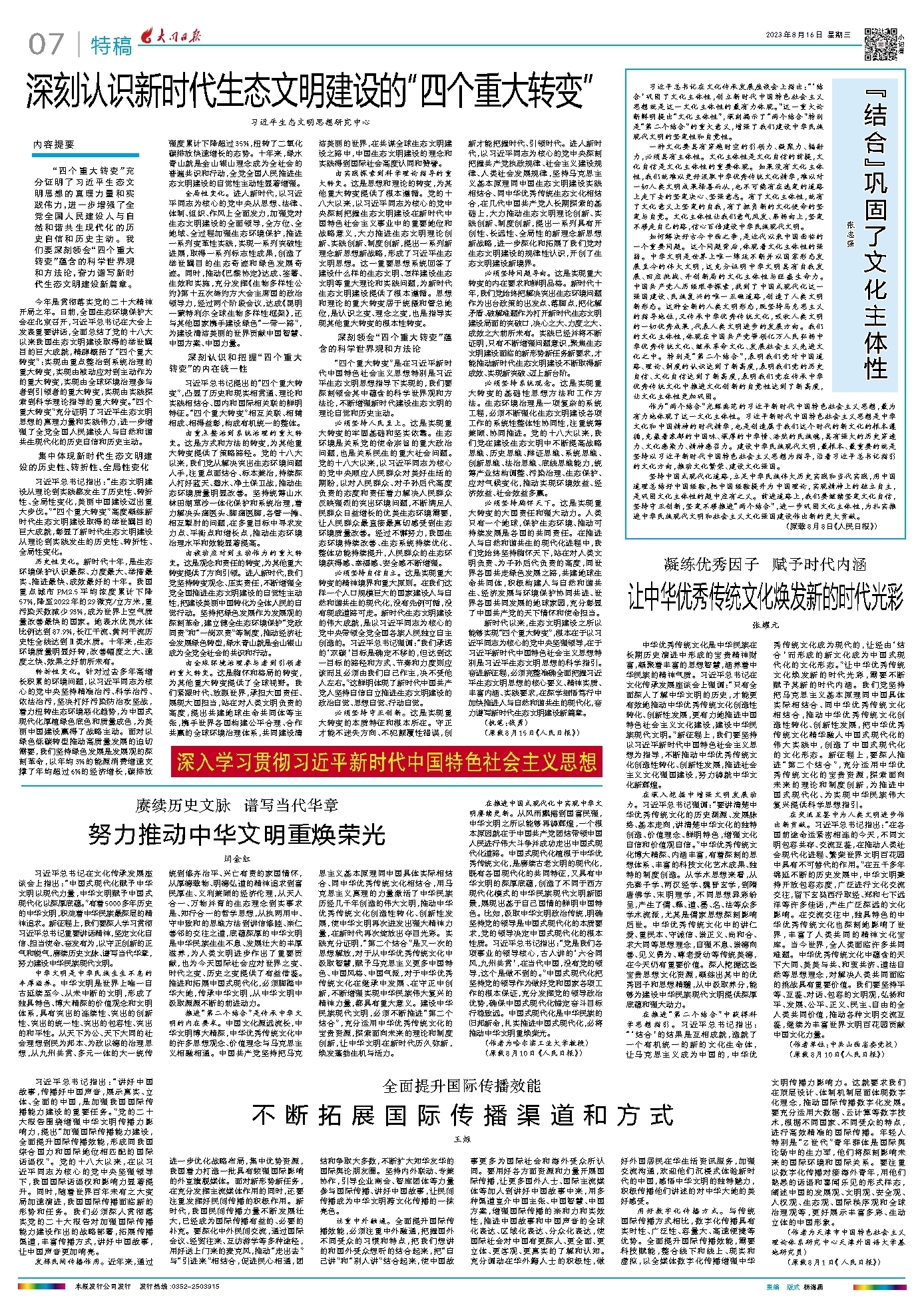 今年是贯彻落实党的二十大精神开局之年。日前,全国生态环境保护大会在北京召开,习近平总书记在大会上发表重要讲话,全面总结了党的十八大以来我国生态文明建设取得的举世瞩目的巨大成就,精辟概括了“四个重大转变”:实现由重点整治到系统治理的重大转变,实现由被动应对到主动作为的重大转变,实现由全球环境治理参与者到引领者的重大转变,实现由实践探索到科学理论指导的重大转变。“四个重大转变”充分证明了习近平生态文明思想的真理力量和实践伟力,进一步增强了全党全国人民建设人与自然和谐共生现代化的历史自信和历史主动。