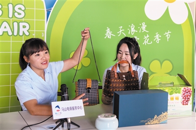 8月15日,马山镇电商服务中心内主播在展示本土特色产品。