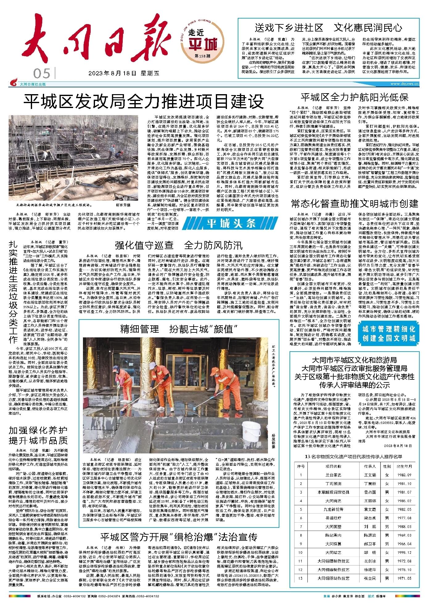 今年是第七届全国文明城市创建三年周期的最后一年,也是我市创建全国文明城市的决战决胜之年。按照《平城区创建全国文明城市工作常态化督查方案》要求,平城区各部门、各街道聚焦“提档升级、突破进位”工作主线,以更高质量、更严标准完成创城工作各项任务,巩固创建成果、提升城市形象,展现“首善”担当。