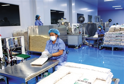 山西全盛正远科技有限公司竹制餐具及竹制活性炭项目,位于左云经济技术开发区新兴产业园内,总投资2.1亿元。该项目主要生产加工竹筷、竹签、竹炭、航空刀叉等产品,利用线上线下渠道销往银川、包头、天津等北方市场。项目分两期建设,全部建成后预计年销售额达9600余万元,解决就业180余人。目前,一期入驻左云乡村振兴产业园,投资6400万元,利用5080平方米的标准厂房年产竹筷、竹签等一次性餐具3000吨,现已投产。图为竹筷生产流水线上,工人们正加紧时间打包装箱。 本报记者 韩堃摄