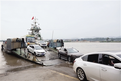 8月28日,车辆在泥溪北渡口下渡船。