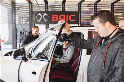 八月二十七日,在南非约翰内斯堡,参观者在北汽展厅参观展车。