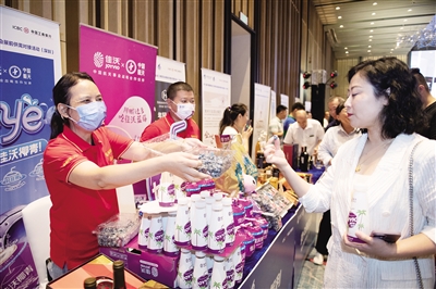 8月29日,在深圳举行的进博会展前供需对接活动上,参展商(左)向采购商介绍进口蓝莓。