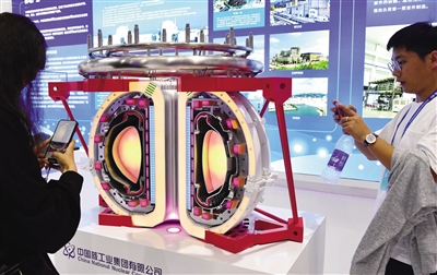 八月二十九日,在2023绿色低碳高质量发展大会装备展上,参观者在观看中国环流三号可控核聚变实验装置模型。当日,2023绿色低碳高质量发展大会装备展在山东省烟台市八角湾国际会展中心举行,共有三百多家企业参展,集中展示了我国在绿色制造、低碳发展方面的建设成果,展览为期三天。 新华社记者 徐速绘摄