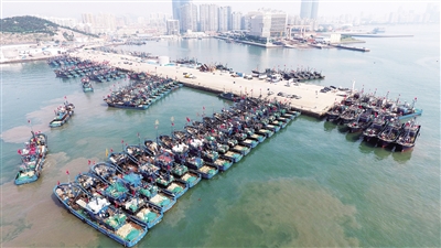 9月1日,在山东省青岛西海岸新区的积米崖中心渔港内,补给充足的渔船蓄势待发(无人机照片)。当日,为期四个月的黄渤海伏季休渔结束,所涉渔区迎来“开海”,各渔港码头千帆竞发,渔船出海进行捕捞作业。 新华社记者 李紫恒摄