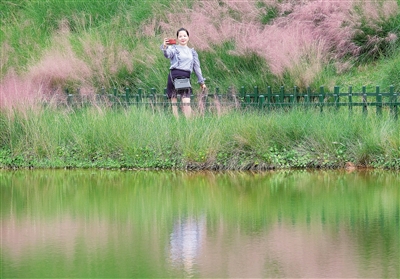 9月11日,一名游客在广西南宁市园博园粉黛乱子草丛旁自拍。