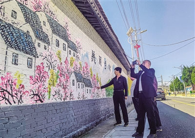 今年以来,灵丘县落水河乡大涧村加大美丽乡村建设力度,先后实施了街道硬化、路灯安装、墙壁美化等工程,村容村貌焕然一新,有效提升了村民的幸福指数。图为9月13日,村民驻足观看墙体画。