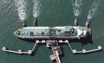 9月13日,来自卡塔尔的“米萨梅尔”号LNG轮在拖轮的协助下向唐山港曹妃甸港区中国石油唐山LNG接收站码头靠泊(无人机照片)。