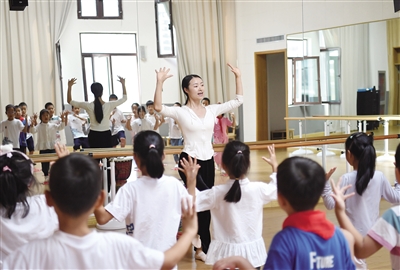 9月13日,雄安史家胡同小学舞蹈老师在为学生上舞蹈课。