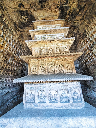 一、雕琢细腻。云冈石窟中期石窟造像更加精美细腻,第6窟雕刻最富丽堂皇,其中的中心塔柱雕刻细腻,美妙绝伦,上层四角雕琢九层汉式楼阁,每面有立式佛像一尊,佛像四周饰有飞天、莲花、坐佛、火焰纹;下层雕刻坐式佛像、菩萨、弟子、力士,整个塔柱设计巧丽,雕琢精细,造型宏伟,气势辉煌,这些雕刻无一不精,共同辉映着整个洞窟的富丽堂皇、无与伦比,是一处“最豪华、最完美的洞窟”。被誉为“音乐窟”的第12窟,其洞窟内那布满四壁的十方诸佛,层层叠叠的飞天伎乐组成了一个宏大的音乐仪式,可以聆听到佛籁之音,清初就曾命名为“佛籁洞”。