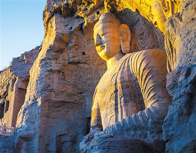 从横向来看,昙曜五窟位干云冈石窟西部,从东(第16窟东壁)到西(第20窟西壁)长达120米,规模宏大,气势磅礴。窟内的主佛体量高大,占据了窟内的绝大部分,昙曜五窟的主尊大佛的造像高度从13.5米到16.8米,有一种顶天立地、高大魁梧的雄伟之感。