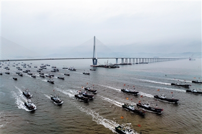 9月16日,浙江奉化渔船驶过象山港大桥,奔向东海开展捕捞作业(无人机照片)。