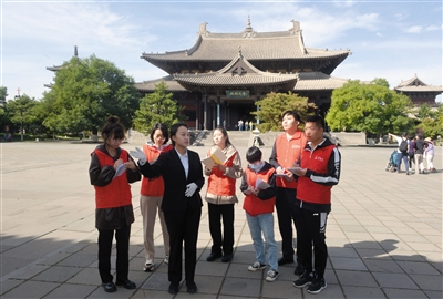 为提高游客中秋国庆假期在景区的游览舒适度,连日来,华严寺景区对各类安全和服务设施进行全方位的排查,并优化服务质量,全力以赴做好各项服务工作。图为景区工作人员对志愿者进行培训。 本报记者 戎禹仁摄