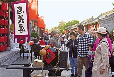 “两节”期间,古城内精彩纷呈的文艺节目轮番上演,趣味十足的主题活动互动不断。图为鼓楼西街的沉浸式表演《古韵集市》,让市民游客沉浸式体验古城民俗文化、人文风情。