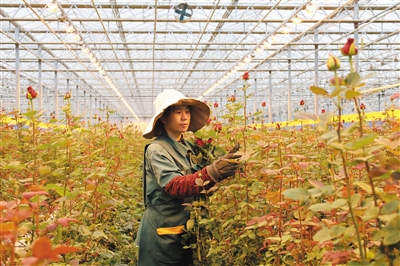 10月17日,在兰州新区现代农业示范园花卉产业基地,务工人员采收玫瑰。