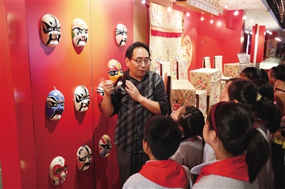 10月25日,在位于湖州市环渚街道的京剧服饰艺术馆,湖州职业技术学院的老师给前来参观的小学生讲解京剧脸谱。