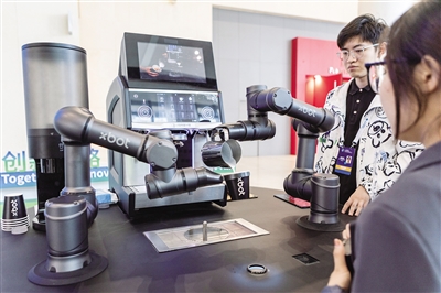 11月6日,在首届“一带一路”科技交流大会会场,参会者等待拉花咖啡机器人制作的咖啡。