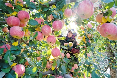 11月7日,在河北省滦州市王店子镇卧龙谷生态农业科技园区,果农在采摘苹果。立冬节气将至,全国各地农民抢抓农时,在田间地头开展农事活动。 新华社发 董军摄