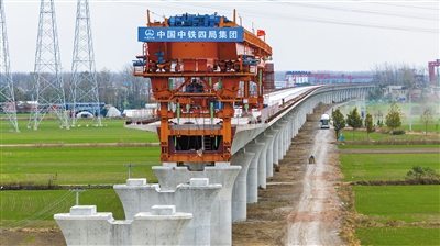 近日,在中铁四局淮宿蚌城际铁路建设工地,施工人员抓紧施工,确保建设进度。淮宿蚌城际铁路途经安徽省淮北市、宿州市、蚌埠市,线路全长约161公里,设计时速350公里,建成后将成为皖北城市群连接合肥都市圈及长三角地区的便捷通道。