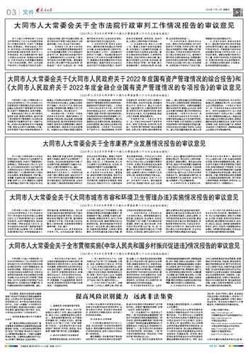 大同市第十六届人大常委会第十七次会议听取和审议了市人民政府2022年度国有资产管理情况的综合报告和金融企业国有资产管理情况的专项报告,并进行了满意度表决,结果为满意。