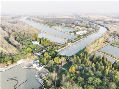 洪泽湖湖水经过周桥渠首流向周桥灌区周桥总干渠(11月8日摄,无人机照片)。
