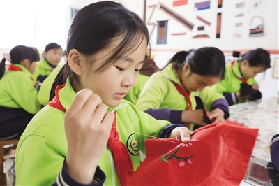 11月13日,在贵州省黔东南苗族侗族自治州施秉县杨柳塘镇中心小学,学生在苗绣课堂学习刺绣。近年来,贵州省黔东南苗族侗族自治州施秉县不断培育和打造苗族刺绣特色产业,引进特色民族文化加工企业,形成集“研、产、销”和旅游观光于一体的苗族刺绣产业链,并采取“公司+实训+农户”的模式,实现线上线下销售,2000余名苗族妇女在家门口就业增收。同时,施秉县还不断加强非遗文化的传承,让当地的孩子们从小接触这一传统技艺,使大山里的“非遗”焕发出新的生机。 新华社发(袁福洪摄)