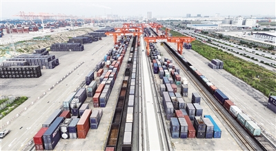 火车在钦州港码头装运集装箱(11月12日摄,无人机照片)。