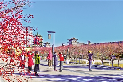 昨日清晨,大同城墙带状公园西城墙段,市民们在海棠树围绕着的小广场上晨练,恢宏的城墙、清澈的护城河、红艳艳的海棠果与晨练的人群在蓝天下构成了一幅优美的画面。 本报记者 张占兵摄