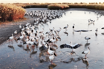 近日,大批东方白鹳、天鹅、大雁等候鸟飞抵河北省唐山市沿海湿地觅食、停留,形成一道靓丽的风景。 新华社记者 杨世尧摄