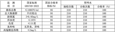 1. 15个采样点常规43项监测结果: 出厂水水质合格率100%;管网水水质合格率100%。