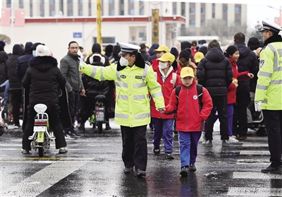 12月13日,广灵县公安局交警大队民警在广灵县第一小学校门口护送学生放学。受降雪天气影响,路面湿滑,给广大师生出行带来了安全隐患。为确保中小学校师生出行安全,交警大队“护学岗”的民警们提前到岗,全面排查学校周边安全隐患,以疏堵保畅、安全巡防、保障交通为主要抓手,确保学校周边道路交通秩序平稳有序。