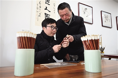 12月21日,佘吉(左)在父亲佘征军指导下制作宣笔。