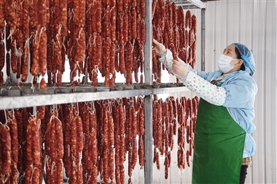 12月24日,陕西一家食品科技发展公司的工作人员在陕西省汉中市镇巴县小洋镇绿色产业园食品加工厂晾制车间检查产品。