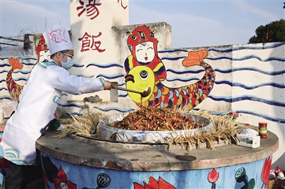 1月5日,和孚镇荻港村的厨师在现场烹饪当地特色的鱼汤饭。