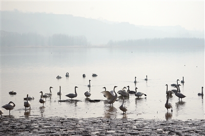 1月9日,白天鹅在山西平陆黄河湿地栖息。