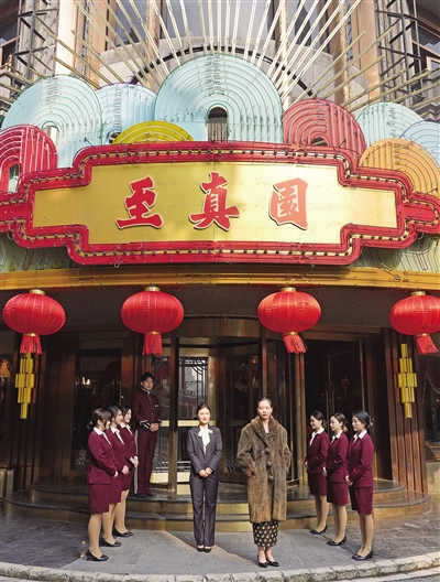 1月6日在上海影视乐园(车墩影视基地)拍摄的电视剧《繁花》中的至真园酒家。乐园复原了剧中的画面和场景,供游客们沉浸式“打卡”。