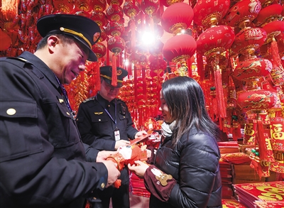 随着春节临近,浙江嘉兴的年货市场年味渐浓,嘉兴市南湖区市场监管局对全区核心商圈和重点场所开展年货市场专项检查,着力营造良好的节日消费环境。图为,执法人员在开盛小商品市场内检查节日装饰用品。 新华社记者 徐昱摄