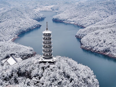 一月二十二日,浙江省东阳市江北街道浪坑水库边上的群山被白雪覆盖(无人机照片)。