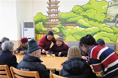 1月22日,在宁波市镇海区金生怡养院,护理员陪着一位失能老人在休闲区玩益智游戏。
