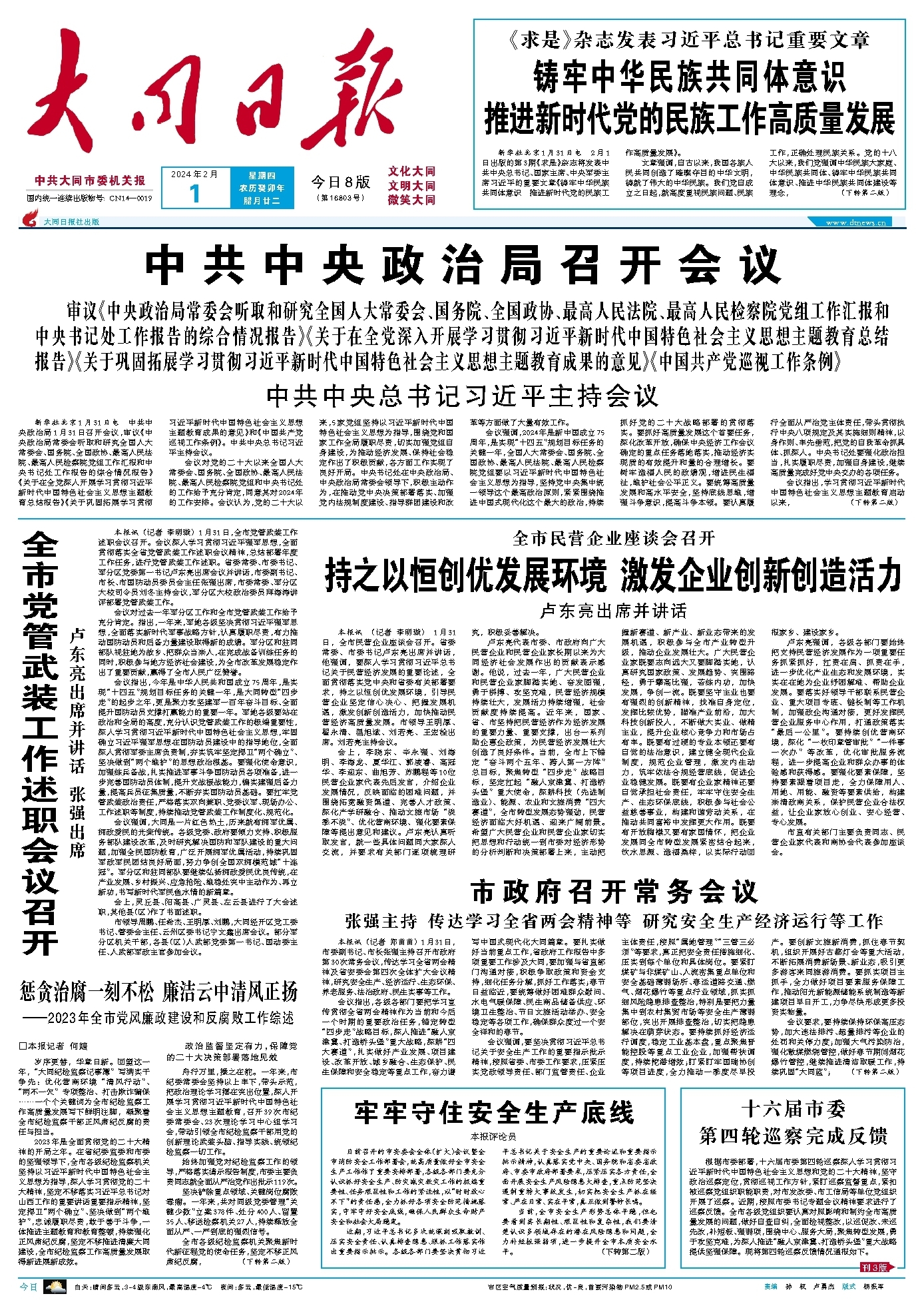 会议强调,要坚决贯彻习近平总书记关于安全生产工作的重要指示批示精神,按照省委、市委工作要求,压紧压实党政领导责任、部门监管责任、企业主体责任,按照“属地管理”“三管三必须”等要求,真正把安全责任措施细化、压实到每个单位和具体岗位。要紧盯煤矿与非煤矿山、人流密集重点单位和安全基础薄弱场所、春运道路交通、燃气、烟花爆竹等重点行业领域,抓实抓细风险隐患排查整治,特别是要把力量集中到农村集贸市场等安全生产薄弱部位,突出开展排查整治,切实把隐患解决在萌芽状态。要持续抓好经济运行调度,稳定工业基本盘,重点聚焦晋能控股等重点工业企业,加强帮扶调度,持续挖潜增效;盯紧盯牢国瑞协创等项目进度,全力推动一季度尽早投产。要创新文旅新消费,抓住春节契机,组织开展好古都灯会等重大活动,不断拓展消费新场景、新业态,吸引更多游客来同旅游消费。要抓实项目主抓手,全力做好项目要素服务保障工作,推动阳光新能源储能系统制造等新建项目早日开工,力争尽快形成更多投资实物量。