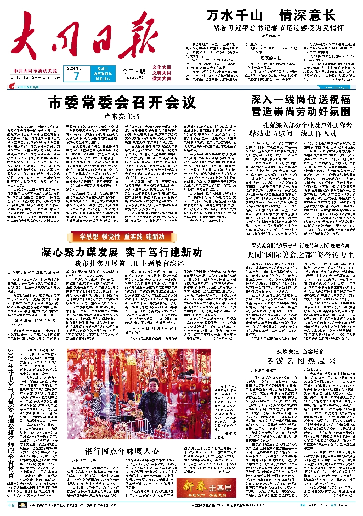 学之愈深、知之愈明、行之愈笃。市县两级组建16支宣讲小分队,开展基层宣讲420场,受众8.9万人。云州区通过强化党员教育三项阵地,有效打通党员教育“最后一公里”;浑源县积极探索“新新向党”“新新向融”党建品牌,助力新兴领域党建提质增效;左云县深入推进离退休干部党组织标准化、规范化建设,激发离退休干部党建新活力;天镇县三举措打造党员教育线上线下新模式……全市8039个基层党组织、19.5万名党员充分运用“三会一课”、主题党日、红色教育基地等方式开展学习,推动理论学习覆盖到每一名党员、干部。